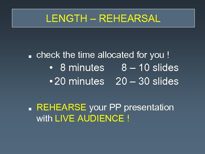 LENGTH – REHEARSAL n check the time allocated for you ! • 8 minutes • 20 minutes n 8 – 10 slides 20 – 30 slides REHEARSE your PP presentation with LIVE AUDIENCE !