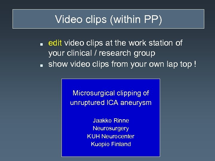 Video clips (within PP) n n edit video clips at the work station of your clinical / research group show video clips from your own lap top ! Microsurgical clipping of unruptured ICA aneurysm Jaakko Rinne Neurosurgery KUH Neurocenter Kuopio Finland