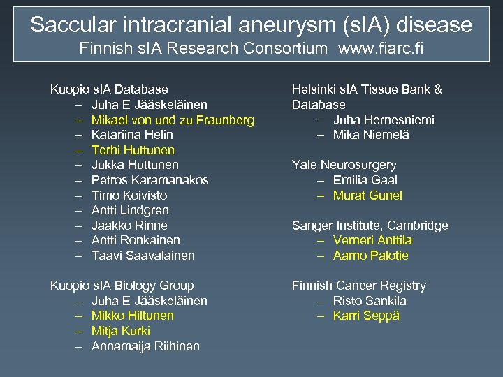 Saccular intracranial aneurysm (s. IA) disease Finnish s. IA Research Consortium www. fiarc. fi Kuopio s. IA Database – Juha E Jääskeläinen – Mikael von und zu Fraunberg – Katariina Helin – Terhi Huttunen – Jukka Huttunen – Petros Karamanakos – Timo Koivisto – Antti Lindgren – Jaakko Rinne – Antti Ronkainen – Taavi Saavalainen Helsinki s. IA Tissue Bank & Database – Juha Hernesniemi – Mika Niemelä Kuopio s. IA Biology Group – Juha E Jääskeläinen – Mikko Hiltunen – Mitja Kurki – Annamaija Riihinen Finnish Cancer Registry – Risto Sankila – Karri Seppä Yale Neurosurgery – Emilia Gaal – Murat Gunel Sanger Institute, Cambridge – Verneri Anttila – Aarno Palotie