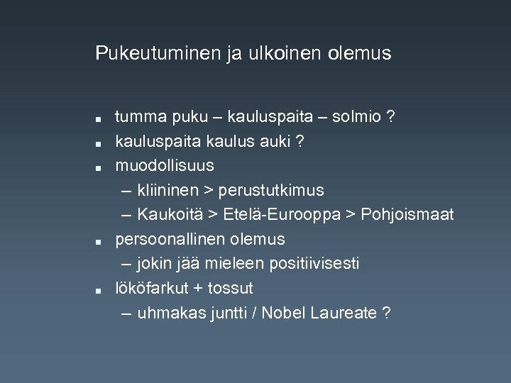 Pukeutuminen ja ulkoinen olemus n n n tumma puku – kauluspaita – solmio ? kauluspaita kaulus auki ? muodollisuus – kliininen > perustutkimus – Kaukoitä > Etelä-Eurooppa > Pohjoismaat persoonallinen olemus – jokin jää mieleen positiivisesti lököfarkut + tossut – uhmakas juntti / Nobel Laureate ?