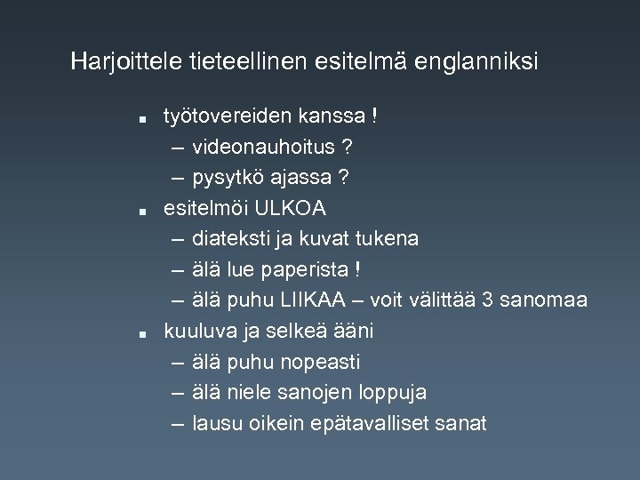 Harjoittele tieteellinen esitelmä englanniksi n n n työtovereiden kanssa ! – videonauhoitus ? – pysytkö ajassa ? esitelmöi ULKOA – diateksti ja kuvat tukena – älä lue paperista ! – älä puhu LIIKAA – voit välittää 3 sanomaa kuuluva ja selkeä ääni – älä puhu nopeasti – älä niele sanojen loppuja – lausu oikein epätavalliset sanat
