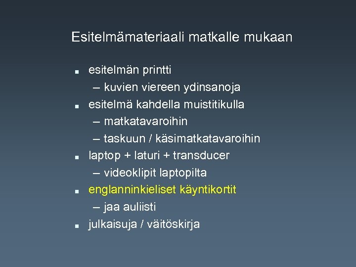 Esitelmämateriaali matkalle mukaan n n esitelmän printti – kuvien viereen ydinsanoja esitelmä kahdella muistitikulla – matkatavaroihin – taskuun / käsimatkatavaroihin laptop + laturi + transducer – videoklipit laptopilta englanninkieliset käyntikortit – jaa auliisti julkaisuja / väitöskirja