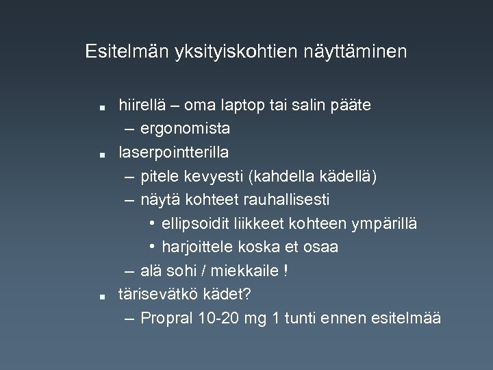 Esitelmän yksityiskohtien näyttäminen n hiirellä – oma laptop tai salin pääte – ergonomista laserpointterilla – pitele kevyesti (kahdella kädellä) – näytä kohteet rauhallisesti • ellipsoidit liikkeet kohteen ympärillä • harjoittele koska et osaa – alä sohi / miekkaile ! tärisevätkö kädet? – Propral 10 -20 mg 1 tunti ennen esitelmää