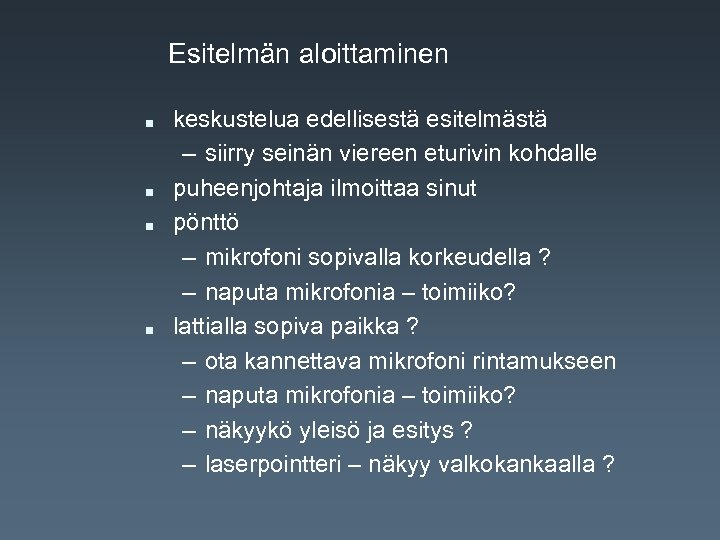 Esitelmän aloittaminen n n keskustelua edellisestä esitelmästä – siirry seinän viereen eturivin kohdalle puheenjohtaja ilmoittaa sinut pönttö – mikrofoni sopivalla korkeudella ? – naputa mikrofonia – toimiiko? lattialla sopiva paikka ? – ota kannettava mikrofoni rintamukseen – naputa mikrofonia – toimiiko? – näkyykö yleisö ja esitys ? – laserpointteri – näkyy valkokankaalla ?
