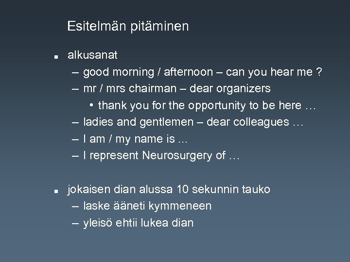 Esitelmän pitäminen n n alkusanat – good morning / afternoon – can you hear me ? – mr / mrs chairman – dear organizers • thank you for the opportunity to be here … – ladies and gentlemen – dear colleagues … – I am / my name is. . . – I represent Neurosurgery of … jokaisen dian alussa 10 sekunnin tauko – laske ääneti kymmeneen – yleisö ehtii lukea dian