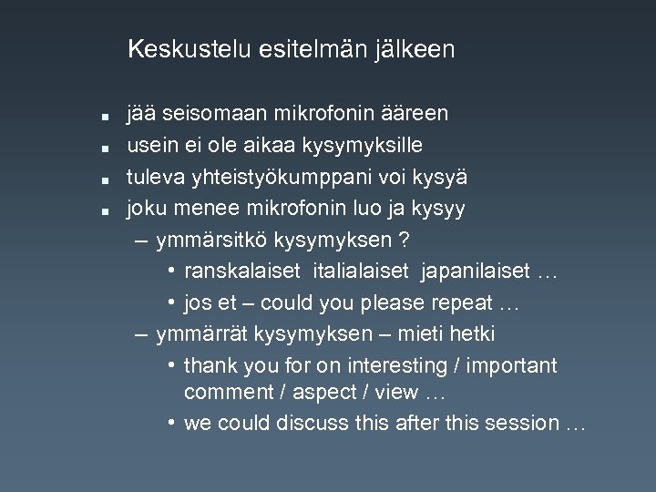 Keskustelu esitelmän jälkeen n n jää seisomaan mikrofonin ääreen usein ei ole aikaa kysymyksille tuleva yhteistyökumppani voi kysyä joku menee mikrofonin luo ja kysyy – ymmärsitkö kysymyksen ? • ranskalaiset italialaiset japanilaiset … • jos et – could you please repeat … – ymmärrät kysymyksen – mieti hetki • thank you for on interesting / important comment / aspect / view … • we could discuss this after this session …