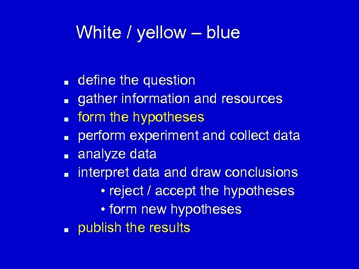 White / yellow – blue n n n n define the question gather information and resources form the hypotheses perform experiment and collect data analyze data interpret data and draw conclusions • reject / accept the hypotheses • form new hypotheses publish the results