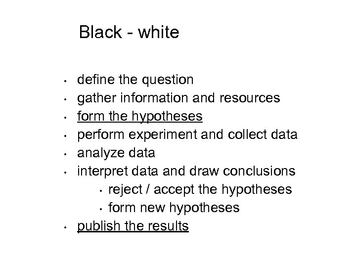 Black - white • • define the question gather information and resources form the hypotheses perform experiment and collect data analyze data interpret data and draw conclusions • reject / accept the hypotheses • form new hypotheses publish the results