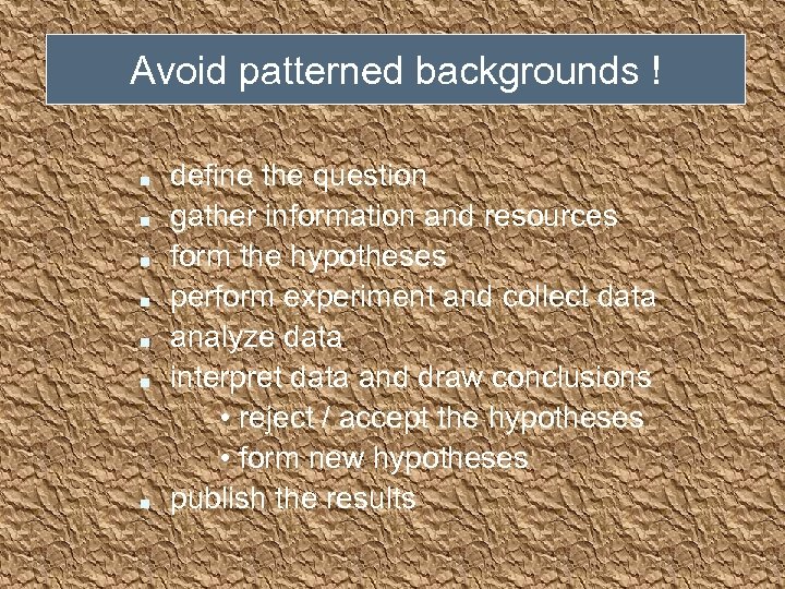 Avoid patterned backgrounds ! n n n n define the question gather information and resources form the hypotheses perform experiment and collect data analyze data interpret data and draw conclusions • reject / accept the hypotheses • form new hypotheses publish the results