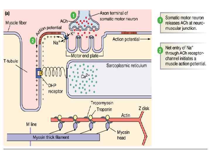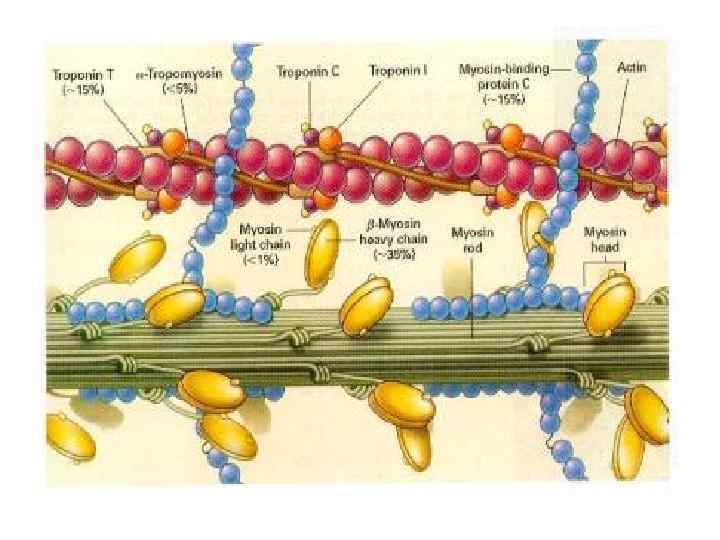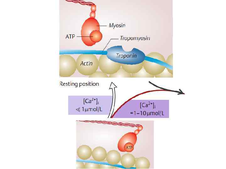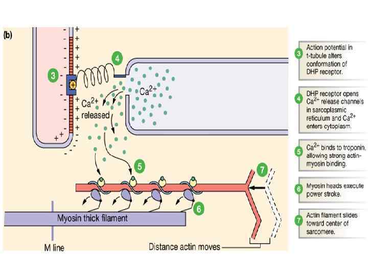 Роль кальция в образовании поперечных мостиков • Возбужденное состояние 1. Мышечное волокно возбуждается и высвобождается Са 2+ 2. Свободный Са 2+ связывается с тропонином, сдвигает тропонинтропомиозиновый комплекс и экспонирует места связывания поперечных мостиков 3. Связывание поперечных мостиков 4. Связывание актина и миозина с помощью поперечных мостиков запускает гребковое движение, которое сдвигает тонкий филамент внутрь во время сокращения