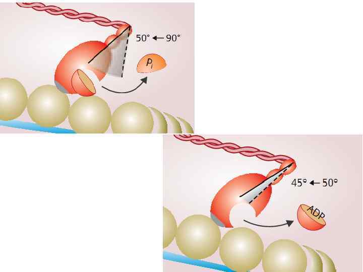 ТЕОРИЯ СКОЛЬЗЯЩИХ НИТЕЙ 5. Связывание головки поперечного мостика (миозин) и актина вызывает изменение формы мостика со смещением ее по направлению к центру саркомера на 45° подобно тому, как весла продвигают лодку. Этот процесс называется РАБОЧИМ ХОДОМ. 6. Рабочий ход сопровождается сдвигом тонкого филамента к центру саркомера только на маленькое расстояние. 7. Наклон головки миозина позволяет высвободить АДФ и Ф.
