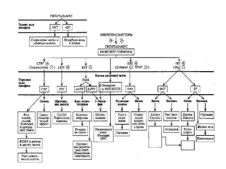 Гормони гіпофіза гіпоталамуса Кортиколіберин Кортикотропін (АКТГ), [ЛПГ, МСГ] Тиреоліберин Тиреотропін (ТТГ) [ЛТГ] Соматоліберин Соматотропін (СТГ, або ГР) Соматостатин Гонадоліберин Соматотропін, [ТТГ, ФСГ, АКТГ] 1. Лютеотропін (, ЛГ) 2. Фолітропін (ФСГ) Пролактоліберин Пролактин (ПРЛ, ЛТГ) Пролактостатин Пролактин Меланоліберин Меланотропін (МСГ) Меланостатин Меланотропін