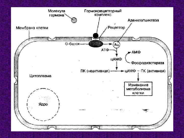 Регуляция активности ферментов. Отдельные белково-пептидные гормоны, а также адреналин и норадреналин не проникают внутрь клеток. Они регулируют обмен веществ, активность многих внутриклеточных ферментов опосредовано через вторичные передатчики, в качестве которых могут выступать циклические нуклеотиды (ц. АМФ, ц. ГМФ), ионы кальция, диацилглицерол, инозитол, специфические белки и другие вещества. Гормоны связываются со специфическими рецепторами на поверхностной мембране клетки и активируют расположенный с внутренней стороны мембраны G-белок. Этот белок активирует или подавляет активность фермента аденилатциклазы. Аденилатциклаза катализирует синтез циклического АМФ из АТФ (рис. 52). Действие ц. АМФ ("вторичный передатчик") внутри клетки реализуется через другой фермент — протеинкиназу (ПК), которая при отсутствии ц. АМФ не активна. Далее ц. АМФ-активируемая протеинкиназа катализирует перекос остатков фосфорной кислоты от АТФ на молекулы различных белков внутри клетки. Фосфорилированию могут подвергаться ферменты расщепления жиров, углеводов, других систем организма. В таком случае усиливается синтез АТФ в клетке, увеличивается количество ферментов белкового синтеза, изменяется функциональная активность клетки. Циклический АМФ расщепляется ферментом фосфодиэстеразой, в результате чего прекращается действие гормона.