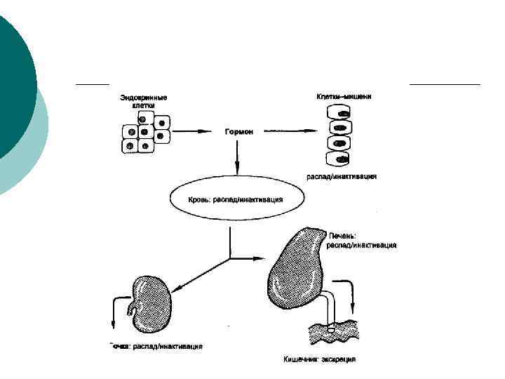 Инактивация (или распад) гормональной молекулы: 1. В тканях-мишенях (в инактивации и экскреции окситацина принимает участие молочная железа) 2. Печень и почки – основные органы, в которых происходит инактивация гормонов и их метаболитов (В печени метаболизм стероидных гормонов идет путем конъюгации с глюкуроновой или серной кислотой. Такие водорастворимые конъюгаты могут секретироваться в желчью выводится с калом , либо поступают в кровь с последующей экскрецией почками )