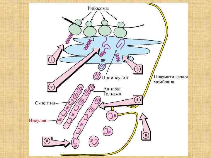 Регуляция синтеза инсулина: Главный регулятор – глюкоза. Другие гормоны: - соматостатин снижает; - адреналин снижает синтез инсулина; - секретин и холецистокинин – повышают; - гормон роста и кортизол повышают.