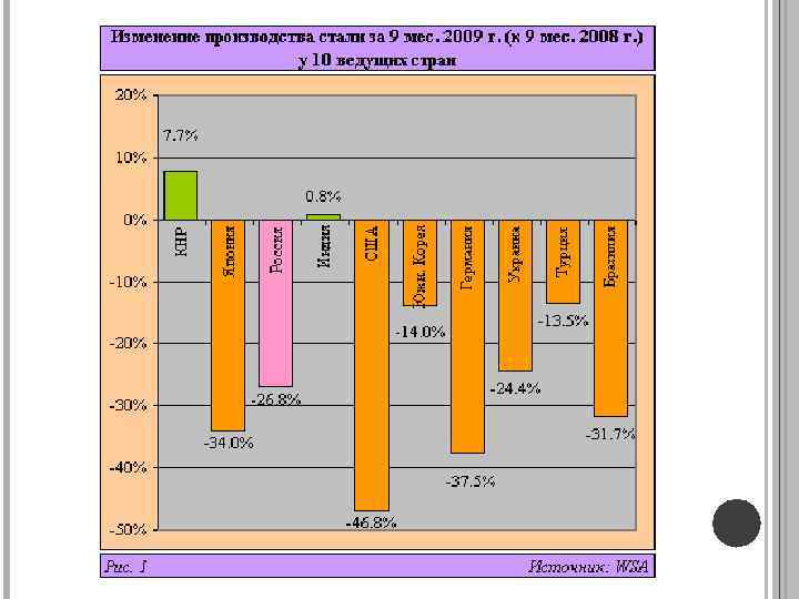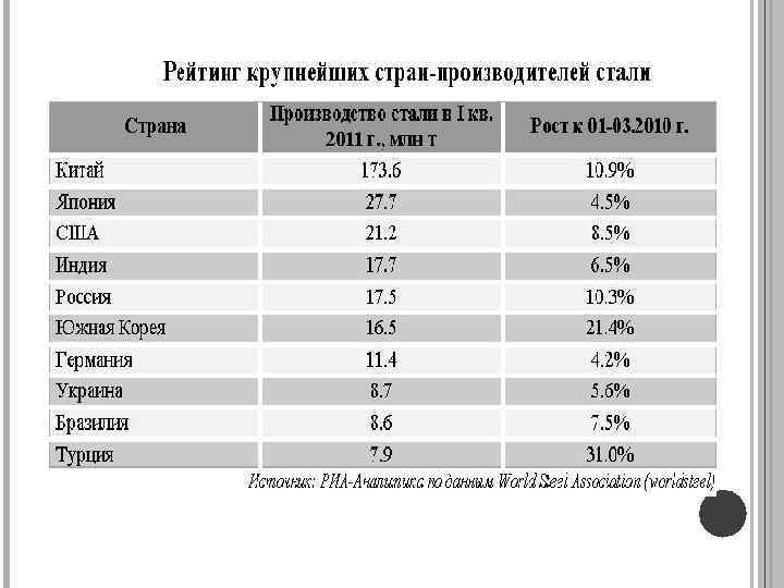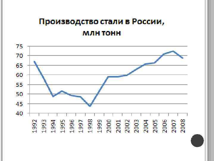 ЗНАЧЕНИЕ ЧЕРНОЁ МЕТАЛЛУРГИИ В НАЦИОНАЛЬНОМ ХОЗЯЙСТВ РОССИИ. Доля чёрной металлургии в объёме промышленного производства России составляет около 10 %. В состав чёрной металлургии входит более 1, 5 тыс. предприятий и организаций, число занятых — около 650 тыс. человек на 2009 год. По производству стали Россия на протяжении последних 10 лет удерживала 4 -е место в мире (72, 4 млн. т в год). В 2009 году Россия опустилась на 5 -е место, в 2011 производство стали составило 68, 28 млн. т в год.