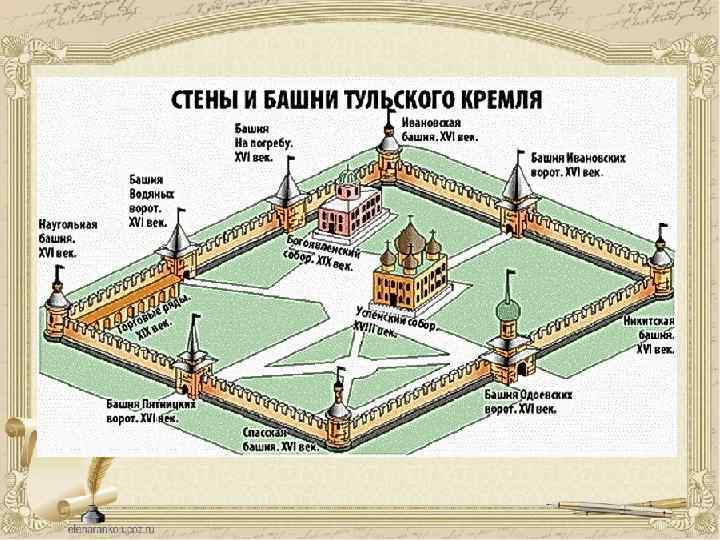 Музей «Тульский Кремль» Пять веков существует Тульский кремль. Построенный в начале 16 века, он длительное время предоставлял надежную защиту от набегов кочевников. Кремль имеет 9 башен, четыре из них с воротами. На территории Кремля находятся два собора. Успенский собор в стиле барокко и Богоявленский собор. В настоящее время в соборе размещается Государственный музей оружия.
