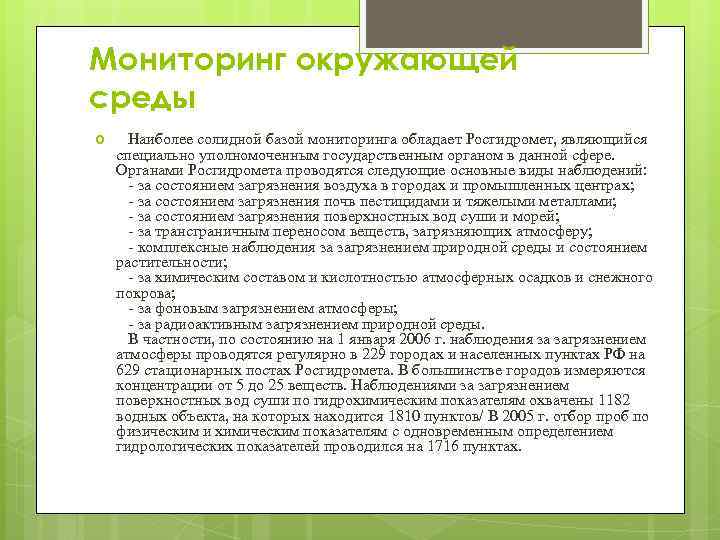 Мониторинг окружающей среды Наиболее солидной базой мониторинга обладает Росгидромет, являющийся специально уполномоченным государственным органом в данной сфере. Органами Росгидромета проводятся следующие основные виды наблюдений: за состоянием загрязнения воздуха в городах и промышленных центрах; за состоянием загрязнения почв пестицидами и тяжелыми металлами; за состоянием загрязнения поверхностных вод суши и морей; за трансграничным переносом веществ, загрязняющих атмосферу; комплексные наблюдения за загрязнением природной среды и состоянием растительности; за химическим составом и кислотностью атмосферных осадков и снежного покрова; за фоновым загрязнением атмосферы; за радиоактивным загрязнением природной среды. В частности, по состоянию на 1 января 2006 г. наблюдения за загрязнением атмосферы проводятся регулярно в 229 городах и населенных пунктах РФ на 629 стационарных постах Росгидромета. В большинстве городов измеряются концентрации от 5 до 25 веществ. Наблюдениями за загрязнением поверхностных вод суши по гидрохимическим показателям охвачены 1182 водных объекта, на которых находится 1810 пунктов/ В 2005 г. отбор проб по физическим и химическим показателям с одновременным определением гидрологических показателей проводился на 1716 пунктах.