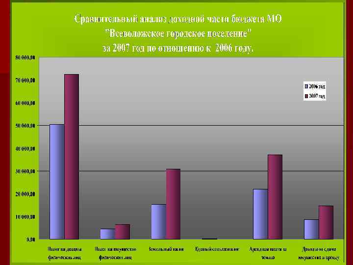 Сравнительный анализ исполнения бюджета МО "Всеволожское городское поселение" по доходам тыс. руб. 2006 год Наименование план отчетнго периода Собственные доходы поселения из них: 2007 год % исполнения отч. период. факт отчетного периода план отчетного периода факт отчетного периода % исполнения отч. период. 148 088, 90 115 465, 90 77, 97 145 779, 00 164 924, 21 113, 13 Налог на доходы физических лиц 68 277, 00 50 344, 00 73, 73 67 500, 00 72 478, 06 107, 37 Налог на имущество физических лиц 12 593, 00 4 378, 60 34, 77 5 500, 00 6 413, 88 116, 62 Земельный налог 28 843, 00 15 351, 00 53, 22 26 000, 00 30 904, 21 118, 86 0, 00 150, 10 212, 00 0, 00 20 484, 00 22 069, 80 107, 74 28 000, 00 37 026, 76 132, 24 Доходы от сдачи имущества в аренду 9 379, 00 8 819, 50 94, 03 14 150, 00 14 609, 22 103, 25 Прочие неналоговые доходы 7 827, 90 13 653, 40 174, 42 3 425, 00 2584, 21 75, 45 Доходы от предпринимательской и иной Приносящей доход деятельности 685, 00 699, 50 992, 00 907, 86 91, 52 Безвозмездные поступления от других бюджетов бюджетной системы РФ из них: 31 968, 00 31 747, 80 99, 31 143 452, 43 143 450, 04 100, 00 Дотации на выравнивание уровня бюджетной обеспеченности 16 937, 00 100, 00 19 387, 50 100, 00 600, 00 379, 80 63, 30 555, 00 100, 00 1 200, 00 1 150, 00 100, 00 12 731, 00 100, 00 3 391, 13 100, 00 500, 00 100, 00 6 255, 30 6 253, 01 99, 96 112 713, 50 112 713, 40 100, 00 46 913, 20 24 246, 38 51, 68 336 144, 63 332 620, 62 98, 95 Единый сельхозналог Арендная плата за землю Субвенция Прочие субвенции Прочие дотации Прочие безвозмездные поступления от Бюджетов субъектов РФ Субсидии бюджетам поселений Прочие безвозмездные поступления Доходы всего 421, 50 180 478, 40 147 635, 20 81, 80