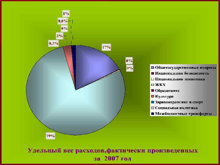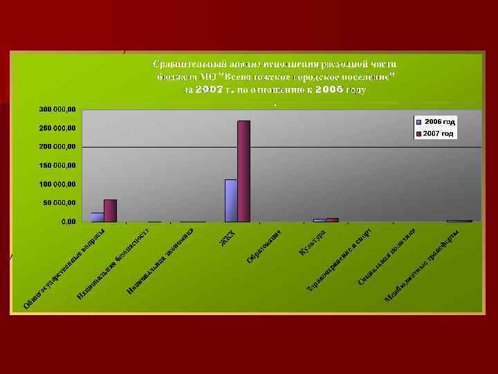 Сравнительный анализ исполнения бюджета МО "Всеволожское городское поселение" по расходам тыс. руб. 2006 годовой план Наименование Общегосударственные вопросы факт отчетного периода 2007 год % исполнения годового плана план отчетного периода факт отчетного периода % исполнения годового плана % Исполнения отч. период. 27 968, 30 24 729, 70 88, 42 64 447, 65 59 823, 10 92, 82 Национальная безопасность 190, 60 168, 40 88, 35 1 131, 27 1 112, 89 98, 38 Национальная экономика 970, 30 100, 00 1 069, 45 869, 59 81, 31 152 318, 50 113 502, 20 74, 52 326 324, 66 270 250, 00 82, 82 256, 00 230, 30 89, 96 711, 95 711, 93 100, 00 8 652, 80 8 265, 40 95, 52 10 273, 40 8 739, 20 85, 07 217, 00 183, 60 84, 61 2 403, 66 717, 85 29, 86 472, 26 0, 00 ЖКХ Образование Культура Здравоохранение и спорт Социальная политика Межбюджетные трансферты 4 636, 10 100, 00 4 561, 23 100, 00 Расходы всего: 195 209, 60 152 686, 00 78, 22 411 395, 53 346 785, 78 84, 29