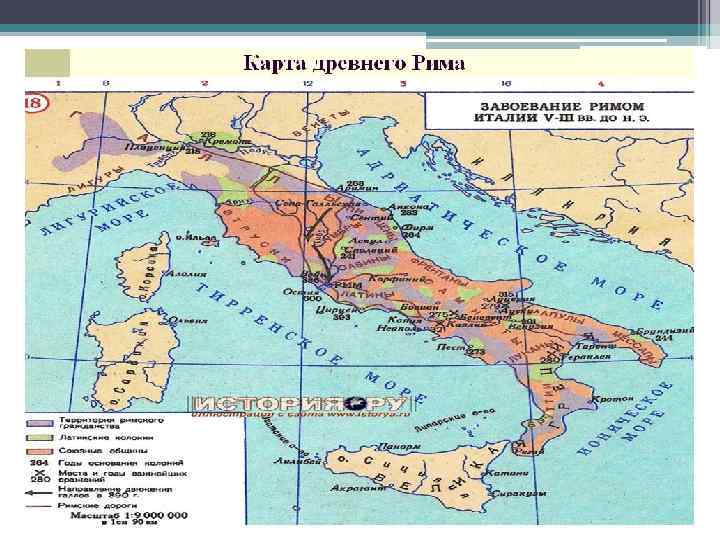 Города-государства Италии. Основание Рима • В 451 -450 гг. до н. э. в Риме впервые были приняты единые для всех законы (до этого споры решались на основе племенных обычаев и традиций). С 445 г. до н. э. разрешались браки между патрициями и плебеями. Еще через столетие плебеям предоставили доступ к выборным должностям, в том числе и консульским. В то же время в Риме должностные лица не получали жалованья, все расходы, связанные с несением службы они покрывали за свой счет. Это обеспечивало доступ к власти только состоятельным гражданам. • Происшедшие перемены означали, что в V в. до н. э. в Риме, как ранее в Афинах, сложилась новая политическая система общественной организации, в которой гражданство имело большее значение, чем родоплеменные связи. • Эти перемены содействовали превращению городов-государств в крупные центры торговли и ремесла. Они принялись наращивать военную мощь и начали борьбу за господство над Средиземноморьем.