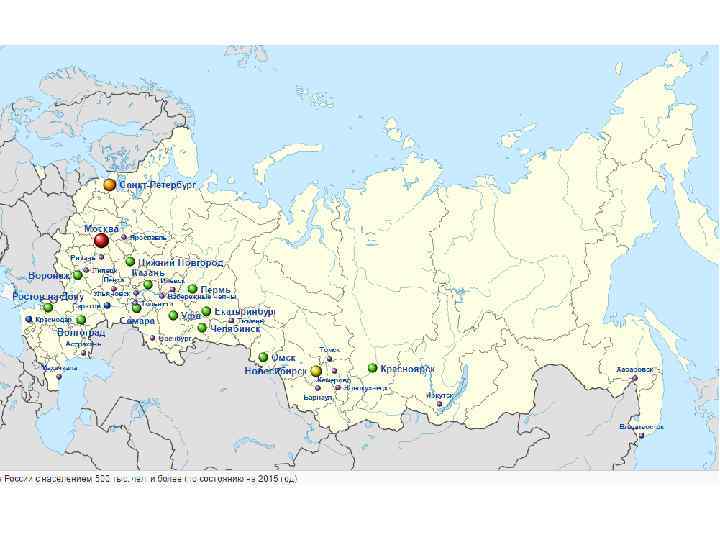 Города России Федеральн ый округ Дальневост очный Приволжски й Северо. Западный Северо. Кавказский Крупнейшие Крупные Большие Средние (свыше 1 (500 тыс. — (250 тыс. — (100 тыс. — (50 тыс. — млн) 1 млн) 500 тыс. ) 250 тыс. ) 100 тыс. ) Малые Итого (до 50 тыс. ) 0 2 2 6 6 50 66 5 7 5 15 36 130 198 1 0 6 4 13 122 146 0 1 3 10 10 32 56 Сибирский 3 5 2 11 20 89 130 Уральский 2 1 5 8 16 83 115 2 3 12 27 36 227 307 2 15 2 21 4 39 9 90 16 153 46 779 79 1097 32079163 12754954 13449683 13895593 10703298 16141189 99023880 32, 40 % 12, 88 % 13, 58 % 14, 03 % 10, 81 % 16, 30 % 100, 00 % Центральны й 3 Южный Итого 3 Население, чел. Население, %