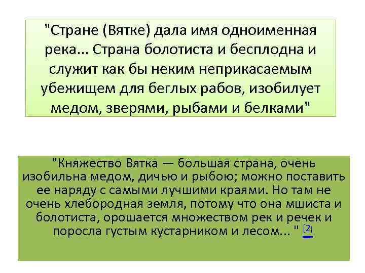 "Стране (Вятке) дала имя одноименная река. . . Страна болотиста и бесплодна и служит как бы неким неприкасаемым убежищем для беглых рабов, изобилует медом, зверями, рыбами и белками" "Княжество Вятка — большая страна, очень изобильна медом, дичью и рыбою; можно поставить ее наряду с самыми лучшими краями. Но там не очень хлебородная земля, потому что она мшиста и болотиста, орошается множеством рек и речек и поросла густым кустарником и лесом. . . " [2].