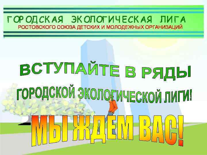 Модель деятельности Городской экологической Лиги Ассамблея Городской экологической Лиги детских и молодежных объединений КООРДИНАЦИОННЫЙ СОВЕТ РУКОВОДИТЕЛЕЙ ПРОГРАММА «ГОРОД НАШЕЙ МЕЧТЫ» АКЦИИ ОБРАЗОВАТЕЛЬНЫЕ ПРОЕКТЫ ПРОЕКТ «ЭКОЛОГИЧЕСКИЕ ИНИЦИАТИВЫ » ПРОЕКТОВ «РОДНИКИ РОСТОВА» ЭКОЛОГИЧЕСКОЙ МОДЫ КОНКУРСЫ ФОТОГРАФИЙ «РОСТОВ ВО ВСЕ ВРЕМЕНА» ЭКОЛОГИЯ ЗДОРОВЬЯ НЕТ ПАКЕТАМ! МУСОР –ЭТО СЕРЬЕЗНО! НЕ СЖИГАЙТЕ, ЛЮДИ, ЛИСТЬЯ! МОЯ ЭКОЛОГИЯ СОЦОПРОСЫ ЧИСТЫЙ ГОРОД ЖИВЫЕ РОДНИКИ РОСТОВА ПТИЧКУ ЖАЛКО! ЗВЕРЬЕ МОЕ РУКА ПОМОЩИ ЭКОЛОГИЯ ДУШИ ГОРОДСКОЙ ЭКОЛОГИЧЕСКИЙ ФЕСТИВАЛЬ «ЭКОФЕСТ»