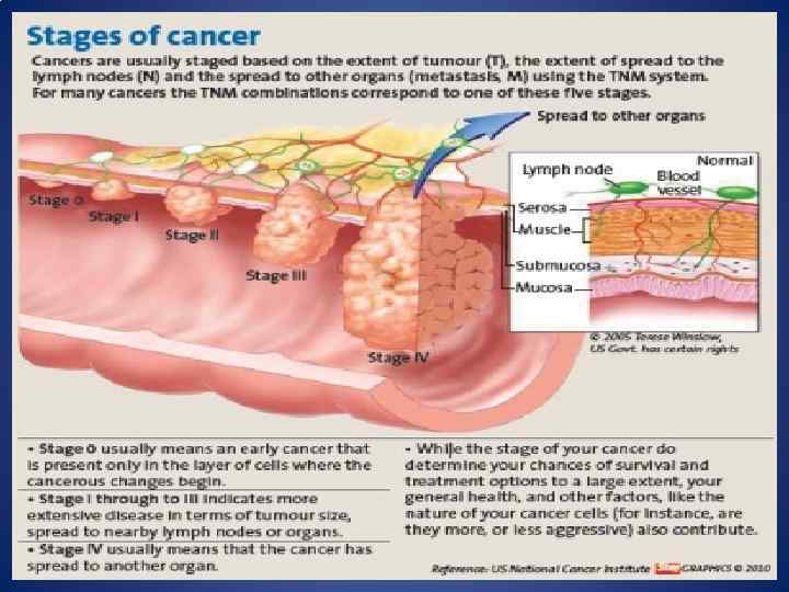 Стадирование больных раком ободочной кишки TNM Cтадия Распространенность 5 -летняя общая выживаемость Tis. N 0 M 0 0 Carcinoma in situ ~ 100% T 1 N 0 M 0 I Слизистая или подслизистая >90% T 2 N 0 M 0 I Собственная мышечная оболочка > 85% T 3 N 0 M 0 II Брюшина / ткани вокруг кишки > 80% T 4 N 0 M 0 II Перфорация или инвазия в другие органы > 72% T 2 N 1 -2 M 0 III A - 62 – 83 % T 3 -4 N 1 M 0 III B - 42 – 64 % T 1 -4 N 2 M 0 III - 27 – 44% Любые T/N M 1 IV Отдаленные метастазы 10 % Европейское общество медицинской онкологии (ESMO)