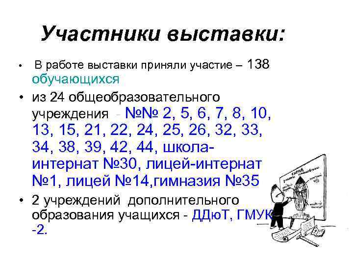 Участники выставки: • В работе выставки приняли участие – 138 обучающихся • из 24 общеобразовательного учреждения - №№ 2, 5, 6, 7, 8, 10, 13, 15, 21, 22, 24, 25, 26, 32, 33, 34, 38, 39, 42, 44, школа- интернат № 30, лицей-интернат № 1, лицей № 14, гимназия № 35 • 2 учреждений дополнительного образования учащихся - ДДю. Т, ГМУК -2.