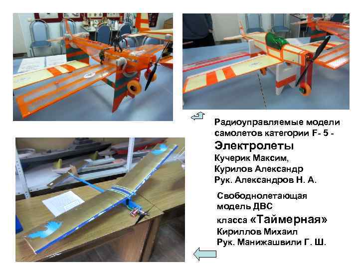 Радиоуправляемые модели самолетов категории F- 5 - Электролеты Кучерик Максим, Курилов Александр Рук. Александров Н. А. Свободнолетающая модель ДВС класса «Таймерная» Кириллов Михаил Рук. Манижашвили Г. Ш.