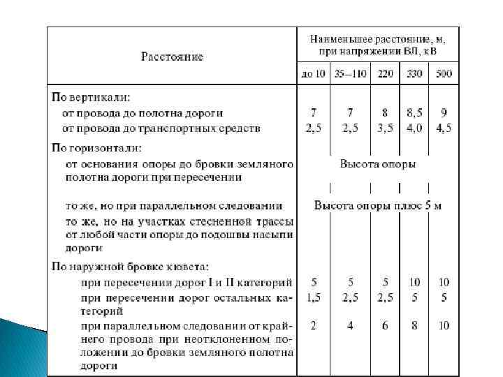 Пересечение кабельной линии железных или автомобильных дорог осуществляется в тоннелях, блоках или трубах на глубине не менее 1 м от земляного полотна дороги. Для воздушных линий передачи при пересечении с железными и автомобильными дорогами, водными преградами применяются специальные усиленные (анкерные) опоры и нормируются наименьшие расстояния до проводов высоковольтной линии.
