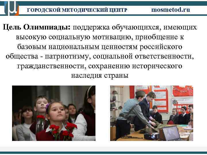 ГОРОДСКОЙ МЕТОДИЧЕСКИЙ ЦЕНТР mosmetod. ru Цель Олимпиады: поддержка обучающихся, имеющих высокую социальную мотивацию, приобщение к базовым национальным ценностям российского общества - патриотизму, социальной ответственности, гражданственности, сохранению исторического наследия страны