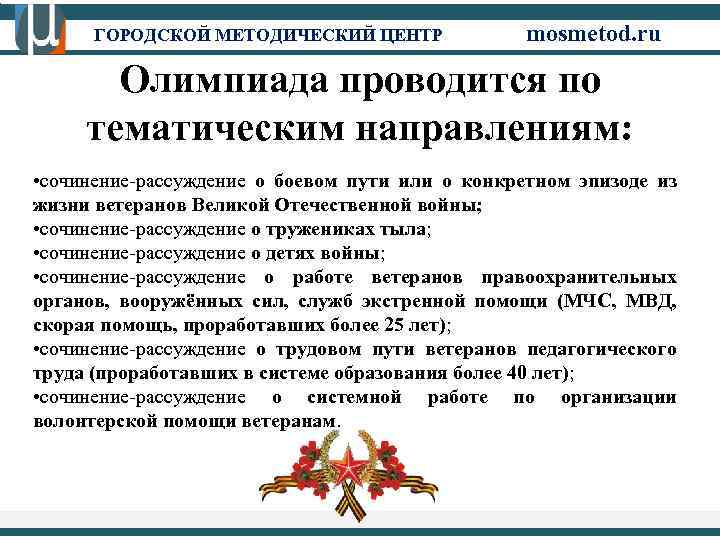 ГОРОДСКОЙ МЕТОДИЧЕСКИЙ ЦЕНТР mosmetod. ru Олимпиада проводится по тематическим направлениям: • сочинение-рассуждение о боевом пути или о конкретном эпизоде из жизни ветеранов Великой Отечественной войны; • сочинение-рассуждение о тружениках тыла; • сочинение-рассуждение о детях войны; • сочинение-рассуждение о работе ветеранов правоохранительных органов, вооружённых сил, служб экстренной помощи (МЧС, МВД, скорая помощь, проработавших более 25 лет); • сочинение-рассуждение о трудовом пути ветеранов педагогического труда (проработавших в системе образования более 40 лет); • сочинение-рассуждение о системной работе по организации волонтерской помощи ветеранам.