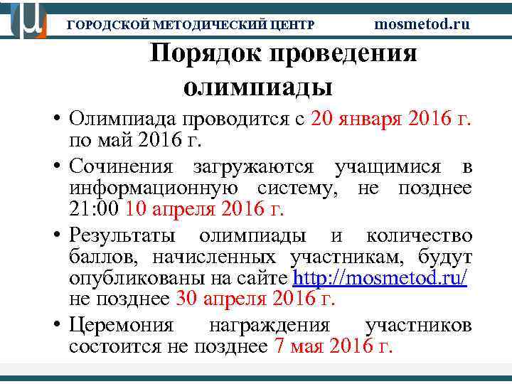 ГОРОДСКОЙ МЕТОДИЧЕСКИЙ ЦЕНТР mosmetod. ru Порядок проведения олимпиады • Олимпиада проводится с 20 января 2016 г. по май 2016 г. • Сочинения загружаются учащимися в информационную систему, не позднее 21: 00 10 апреля 2016 г. • Результаты олимпиады и количество баллов, начисленных участникам, будут опубликованы на сайте http: //mosmetod. ru/ не позднее 30 апреля 2016 г. • Церемония награждения участников состоится не позднее 7 мая 2016 г.