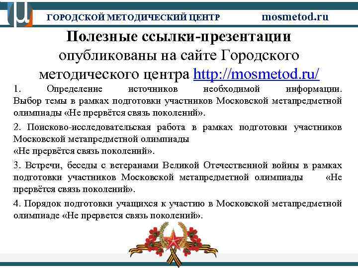 ГОРОДСКОЙ МЕТОДИЧЕСКИЙ ЦЕНТР mosmetod. ru Полезные ссылки-презентации опубликованы на сайте Городского методического центра http: //mosmetod. ru/ 1. Определение источников необходимой информации. Выбор темы в рамках подготовки участников Московской метапредметной олимпиады «Не прервётся связь поколений» . 2. Поисково-исследовательская работа в рамках подготовки участников Московской метапредметной олимпиады «Не прервётся связь поколений» . 3. Встречи, беседы с ветеранами Великой Отечественной войны в рамках подготовки участников Московской метапредметной олимпиады «Не прервётся связь поколений» . 4. Порядок подготовки учащихся к участию в Московской метапредметной олимпиаде «Не прервется связь поколений» .