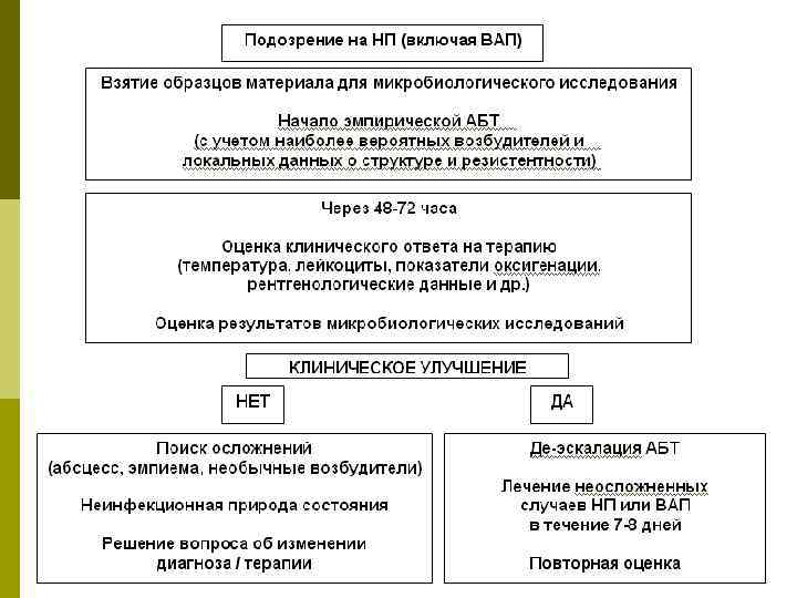 ОБЩИЕ ПОДХОДЫ К ВЕДЕНИЮ ПАЦИЕНТОВ С НП Все мероприятия, необходимые при ведении пациента с НП, можно подразделить на три группы: p 1) диагностические исследования, направленные на: n n n p p уточнение нозологического диагноза (исключение синдромо-сходных заболеваний); идентификацию возбудителя; оценку тяжести заболевания 2) неотложное начало адекватной АБТ (после взятия материала для микробиологического исследования) 3) Дополнительные мероприятия: n n n профилактика эндогенного и экзогенного инфицирования; симптоматическая и патогенетическая терапия; профилактика / коррекция полиорганной недостаточности и / или септического шока.