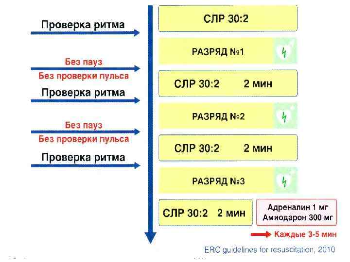 РЕКОМЕНДАЦИИ ECC Guidelines 2011 г. СОХРАНЯЕТСЯ ДВЕ СХЕМЫ ДЕФИБРИЛЛЯЦИИ: 1. схема стабильных доз 200 - 200 Дж 2. схема возрастающих доз 200; 360 Дж После проведения первичного разряда в течение 2 минут Проводится СЛР, начиная (!!!) с массажа сердца (30: 2) Анализ ритма/пульса сразу после разряда не проводится !!!