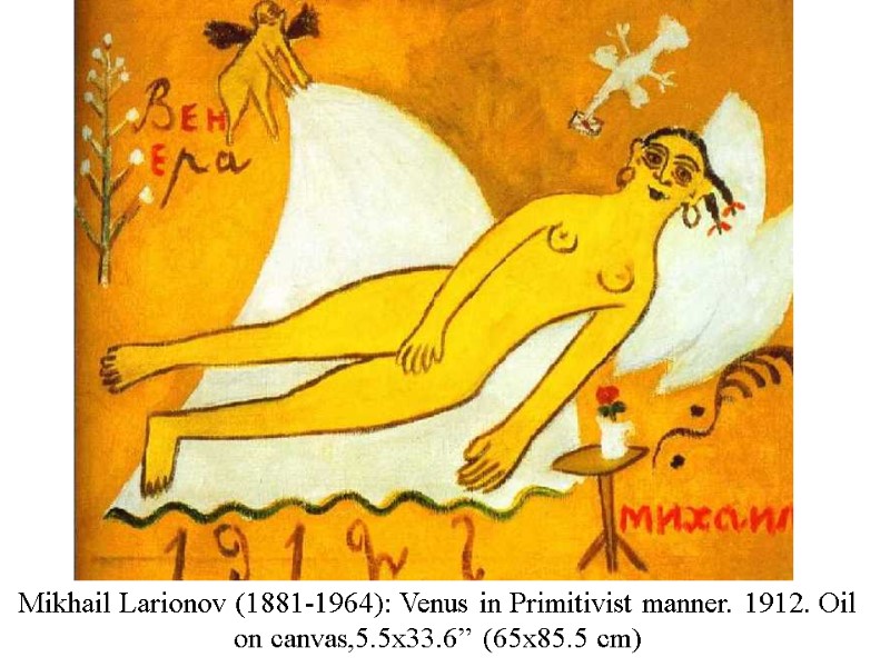Mikhail Larionov (1881-1964): Venus in Primitivist manner. 1912. Oil on canvas,5.5x33.6” (65x85.5 cm)