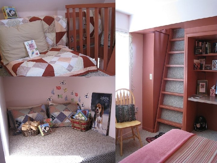 • • В комнатах имеется кровать Queen и два раскладывающихся дивана (на 2 -м этаже). Помимо этого есть ванная, микроволновка и маленький холодильник. Имеются также кофеварка, фен и часы, которые одновременно являются будильником и радиоприемником. В номере располагается также библиотека и набор настольных игр. Можно отметить, что в номерах отсутствуют телефон и телевизор, возможно, это сделано для того, чтобы полностью отречься и отдохнуть от земной, шумной жизни и насладиться умеренной и спокойной загородной жизнью, наблюдая через окна отеля-собаки на живописный вид на засеянные поля и холмистый ландшафт, напоминающий зеленые волны.