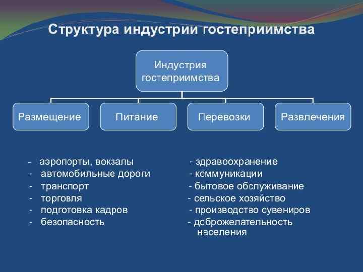 Индустрия гостеприимства это сложная, комплексная сфера профессиональной деятельности людей, усилия которых направлены на удовлетворение разнообразных потребностей клиентов (гостей), как туристов, так и местных жителей.