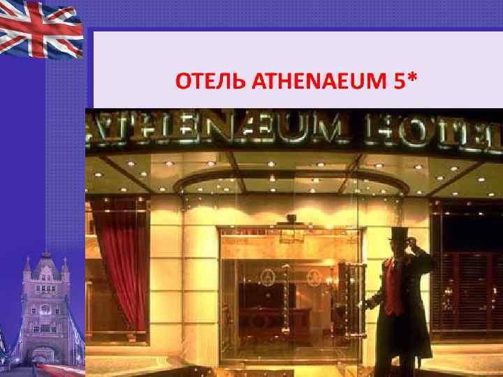 Отель Athenaeum 5* входит в цепочку The Small Luxury Hotels of the World. Отель предлагает роскошные номера и безупречный сервис. По версии журнала Conde Nast Traveler The Athenaeum Hotel and Apartments является лучшим отелем Лондона 2005. Расположение: Расположен на Piccadilly с выходом в Green Park. Ближайшая станция метро - Green Park. В отеле: 123 элегантных номеров (из них 12 suites) – сочетание английских традиций и современных технологий. Многие комнаты имеют прекрасный вид на Грин-парк, Вестминстер и Букингемский дворец. В каждом номере: кондиционер, ванная комната с феном и халатами, плазменные TV панели, телефон, доступ в Интернет, мини-бар, приборы для приготовления чая и кофе, сейф.