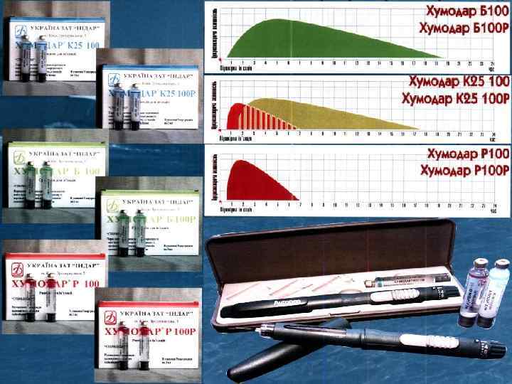 Препарати інсуліну Тваринні: 1 мл. – 100 Од Короткої дії: (Україна). Початок дії через півгодини, максимум дії-третя година, тривалість 6 -8 год. Середньої тривалості: Монодар Б (Україна). Початок дії через 1 годину, максимум дії 6 -7 година, тривалість 12 год. Довготривалої дії: Монодар-Ультралонг (Україна). Початок дії через 1 -1, 5 години, максимум дії 12 -13 година, тривалість 24 -30 годин. Людські: 1 мл. – 100 Од. Короткої дії: Хумодар R (Україна), Фармасулін Н (Україна). Середньої тривалості: Хумодар B (Україна), Фармасулін НNP (Україна). Аналоги інсуліну: 1 мл. – 100 Од. Короткої дії: Новорапід (Данія), Епайдра (Німеччина) Довготривалої дії: Левемір (Данія), Лантус (Німеччина) Розрахунок добової дози За рівнем глюкози в сечі – кожні 4 гр. глюкози 1 Од інсуліну. За масою тіла – 0, 5 -0. 6 Од на 1 кг/доб – при вперше виявленому(дебюті) діабеті.
