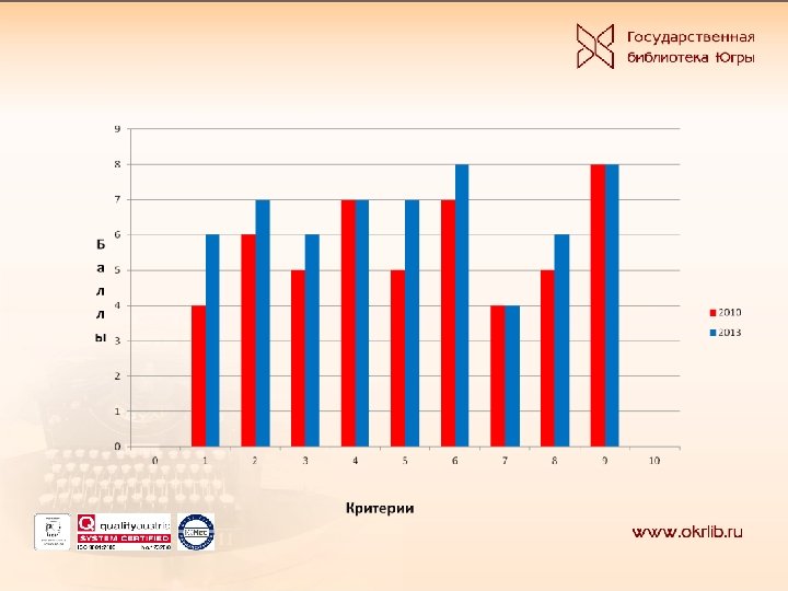 Показатель (результативность) Возможности - 65 баллов Критерий 1 - 13 Критерий 2 - 13 Критерий 3 - 13 Критерий 4 - 13 Критерий 5 - 13 Результаты - 52 балла Критерий 6 - 13 Критерий 7 - 13 Критерий 8 - 13 критерий 9 -13 Общий показатель качества Показатель качества возможности Показатель качества результатов Оценка в баллах (эффективность) 2010 год 2013 год % от максимальной оценки 1000 баллов 2010 год 2013 год 4 6 5 7 5 7 4 5 7 6 7 7 8 4 6 8 30, 8 46, 1 38, 5 53, 8 38, 5 53, 8 30, 8 38, 5 53, 8 46, 2 53, 8 61, 5 30, 8 46, 2 61, 5 50 59 42, 7 50, 4 27 33 41, 5 50, 8 23 26 44, 2 50, 0