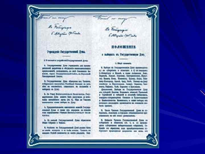 В критический для власти момент (октябрь 1905 г. ) Николай II согласился пойти на уступки. В результате 17 октября 1905 года был обнародован «Манифест об усовершенствовании Государственного порядка» о даровании гражданам России политических прав и свобод. 23 апреля публикуется "Свод основных государственных законов", а 27 апреля 1906 г. в уникальном зале Таврического дворца Санкт-Петербурга состоялось первое заседание российской Государственной Думы первого созыва.