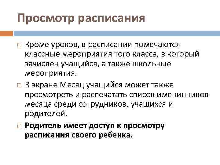 Просмотр расписания Кроме уроков, в расписании помечаются классные мероприятия того класса, в который зачислен учащийся, а также школьные мероприятия. В экране Месяц учащийся может также просмотреть и распечатать список именинников месяца среди сотрудников, учащихся и родителей. Родитель имеет доступ к просмотру расписания своего ребенка.