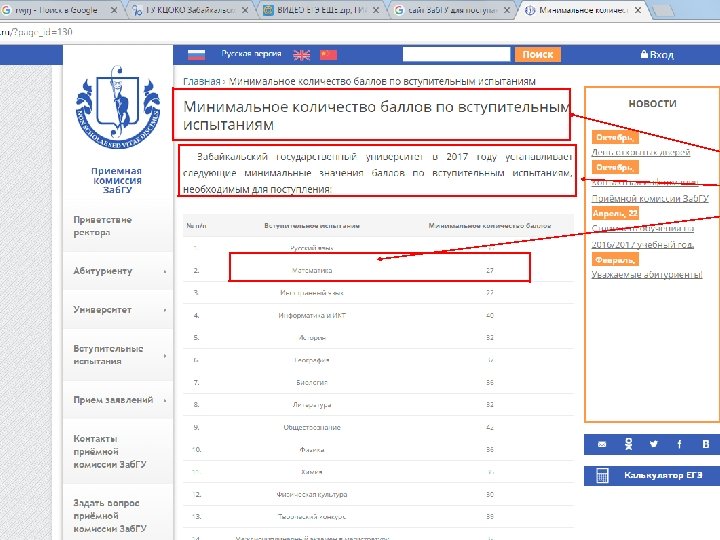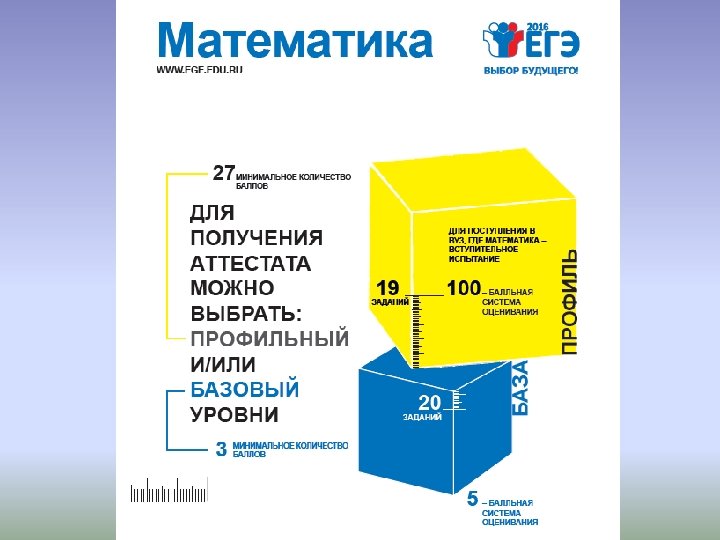 Для поступления в ВУЗы в 2016 г. установлены следующие минимальные баллы ЕГЭ Предметы Баллы Русский язык 36 Математика профильного уровня 27 Физика 36 Химия 36 Информатика и ИКТ 40 Биология 36 История 32 География 37 Иностранный язык 22 Литература 32 Обществознание 42 ВАЖНО! ВУЗы имеют право устанавливать свои минимальные баллы (с которыми будут принимать абитуриентов) выше этого уровня!