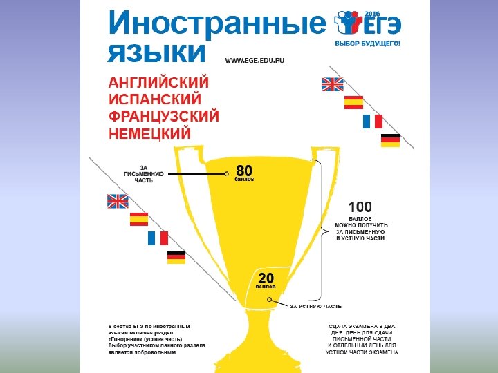 РАСПИСАНИЕ Досрочный период: 14 марта (вт) - математика Б, П 16 марта (чт) - информатика и ИКТ, история, химия 18 марта (сб) - иностранные языки (устн) 20 марта (пн) – русский язык 22 марта (ср) – иностранные языки, биология, физика 24 марта (пт) - география, литература, обществознание 3 апреля (пн) – резерв 5 апреля (ср) - резерв 7 апреля (пн) - резерв
