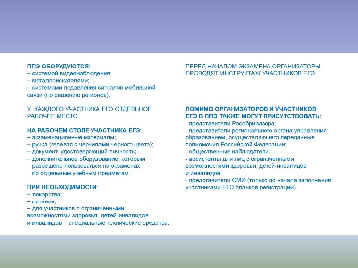 Перечень условных обозначений и сокращений ГИА Государственная итоговая аттестация по образовательным программам среднего общего образования ГЭК Государственная экзаменационная комиссия субъекта Российской Федерации ЕГЭ Единый государственный экзамен ИК КИМ Индивидуальный комплект участника ЕГЭ Контрольные измерительные материалы Образовательная Организация, осуществляющая образовательную деятельность по имеющей государственную организация аккредитацию образовательной программе ОИВ Органы исполнительной власти субъектов Российской Федерации, осуществляющие государственное управление в сфере образования Порядок проведения государственной итоговой аттестации по образовательным программам среднего общего образования, утвержденный приказом Минобрнауки России от 26. 12. 2013 г. № 1400 (зарегистрирован Минюстом России 03. 02. 2014, регистрационный № 31205) ППЭ Пункт проведения экзаменов РИС Региональная информационная система обеспечения проведения ГИА обучающихся, освоивших основные образовательные программы основного общего и среднего общего образования Рособрнадзор ЕГЭ с ОВЗ ФИПИ ФЦТ Федеральная служба по надзору в сфере образования и науки Обучающиеся с ограниченными возможностями здоровья, дети-инвалиды и инвалиды ФГБНУ «Федеральный институт педагогических измерений» ФГБУ «Федеральный центр тестирования»