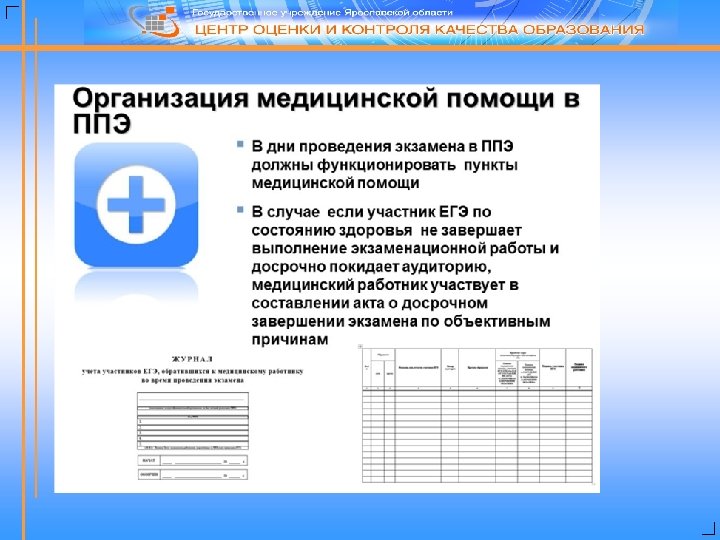 Обратить внимание на помещения ППЭ Ø Должны быть выделены помещения для общественных наблюдателей, медицинского работника (указанные помещения должны быть изолированы от аудиторий для сдачи экзамена) Ø Помещения для сопровождающих обучающихся, представителей СМИ, а также места для хранения личный вещей участников, организаторов, медицинских работников, технических специалистов и ассистентов, оказывающим необходимую техническую помощь участникам ЕГЭ с ОВЗ, инвалидам и детям-инвалидам организуются до входа в ППЭ (до рамки стационарного металлоискателя или места использования переносного металлоискателя)